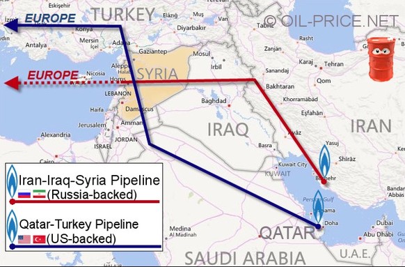 Die Hauptakteure der ausländischen Parteien, die in Syrien Krieg führen, sind Gas-Exporteure mit Interessen in einem von zwei umkämpften Pipeline-Projekten. Dabei geht es um die Ausbeute der weltgrössten Erdgasreserven, nämlich des Gasfeldes South Pars/North Dome, welches auf dem Grund des Persischen Golfs liegt und zum Teil dem Iran, zum Teil Katar gehört. Beide Länder begannen 1989 mit der Förderung.