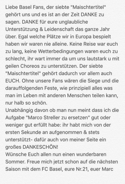 Freue mich jetzt schon auf die nächsten Saison mit dem FC Basel, eure Nummer 21, euer Marc.