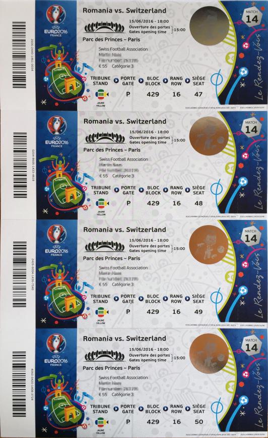 V: 4 Tickets, EM, Rumänien - Schweiz, 15.6., Paris, je CHF 50.00