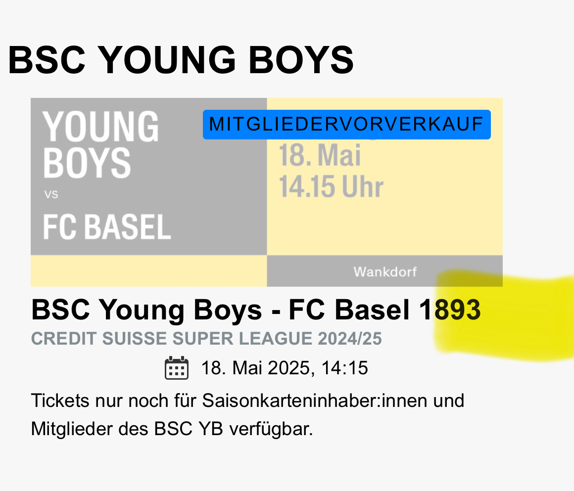 tiimnoah hat geschrieben: 29.04.2025, 11:34Die Seite ist nicht Down, glaube die haben schnell gehandelt und wollen möglichst wenig Basler im C. Deshalb der Vorverkauf nur noch für Mitglieder. Für das Spiel gegen Luzern funktioniert noch alles.Bechamp hat geschrieben: 29.04.2025, 11:27ferran hat geschrieben: 29.04.2025, 11:24 Ist das Spiel schon ausverkauft oder weshalb erhalte ich eine Fehlermeldung, wenn ich unter diesem Link auf das Spiel klicke: https://www.bscyb.ch/einzeltickets