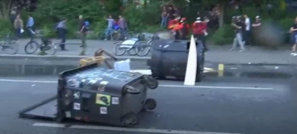Auf einen unbesetzten Streifenwagen sei ein Molotowcocktail geworfen worden, der aber nicht gezündet habe. Ein Polizeihubschrauber sei mit einer Leuchtrakete angegriffen worden, das Geschoss habe den Hubschrauber nur knapp verfehlt.