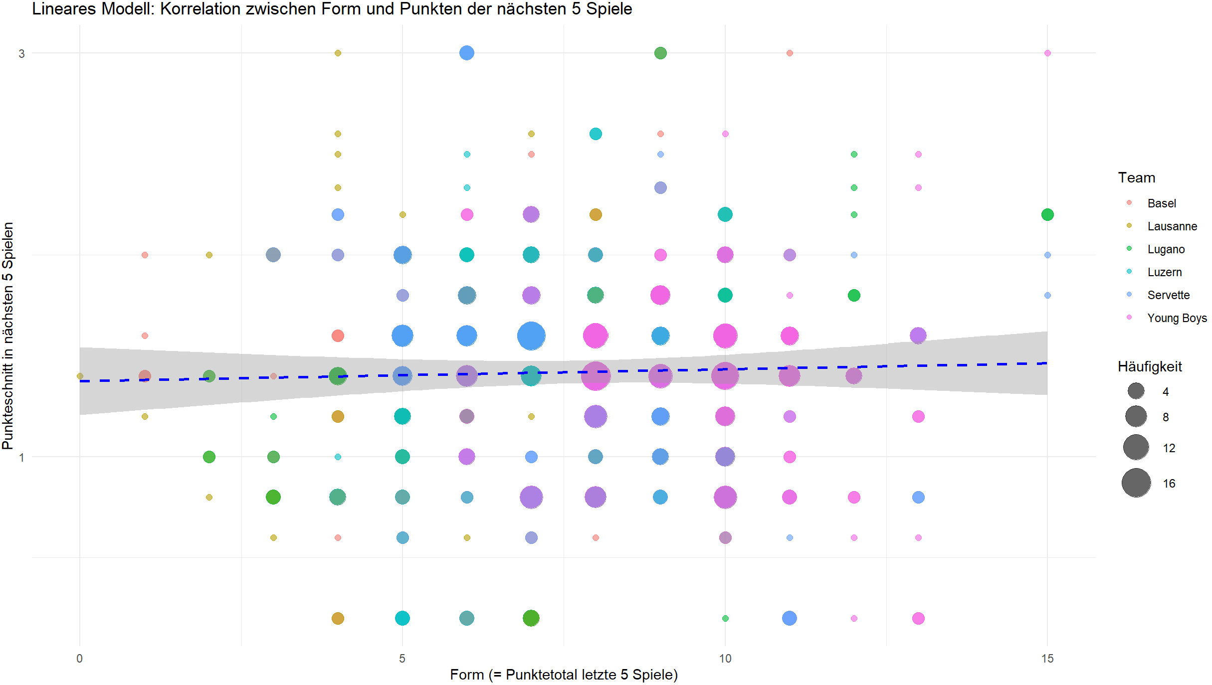 Ich habe das nun mit einer eigenen Analyse angeschaut mit der gleichen Datentabelle. Bei mir zeigte sich über etwa 2250 Spielen, also 4500 Vergleichen von Form zum Resultat im nächsten Spiel, einen hohen Einfluss der Form auf die Punktausbeute