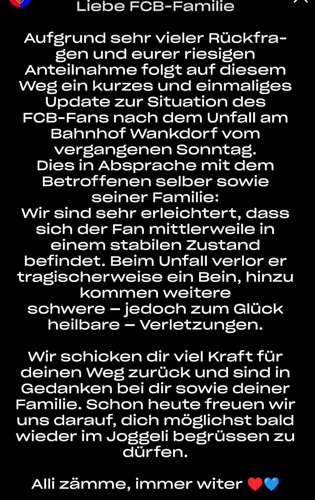 In Anbetracht der ursprünglichen Befürchtungen (zumindest bei mir) ein zwar sehr tragisches, aber doch auch erleichterndes Update. Kann mich nur anschliessen - ganz gute Genesung und bis im Joggeli!