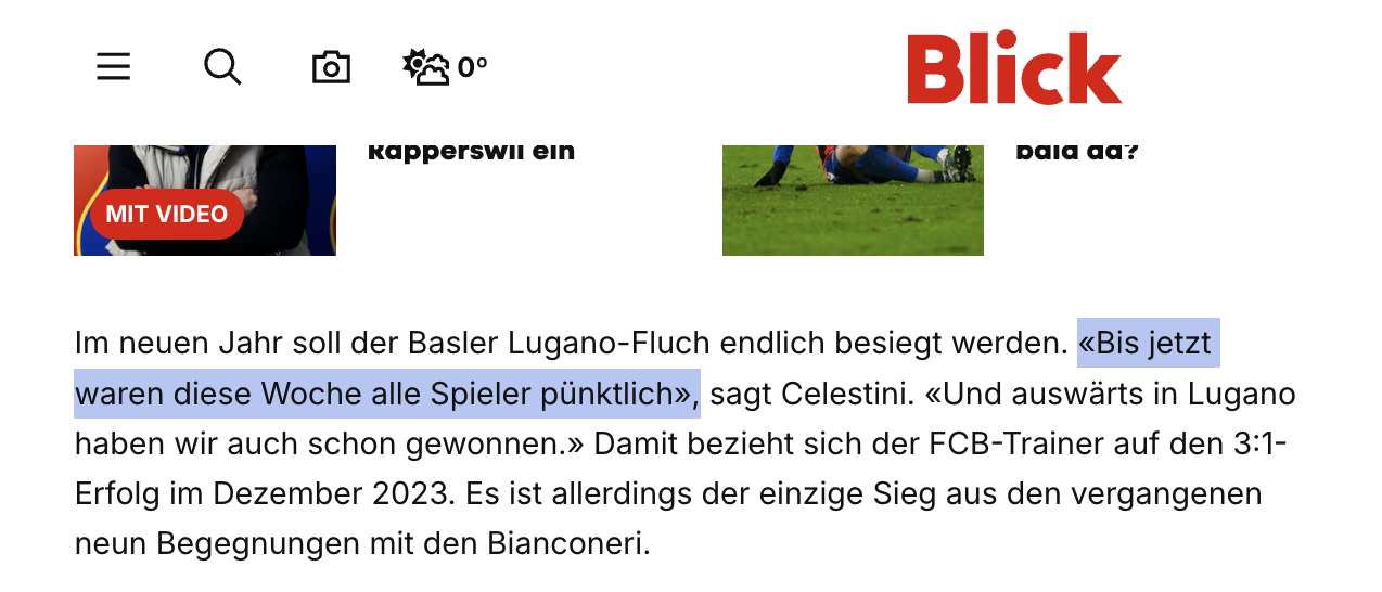 Diese Woche waren bisher alle Pünktlich (Quelle Blick). Kontext: Blick schrieb von den letzten 4 Spielen gegen Lugano gingen 4 verloren. Und das Spieler nicht dabei waren weil sie wegen Unpünktlichkeit nicht im Kader waren