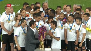 Und Hand aufs Herz: Was hätte Callà noch gross erzählen können, was er nicht schon an der letzten Feier gesagt hat? Er hätte eventuell die Spieler nochmals einzeln aufrufen können, aber dann hätte er einfach die inoffizielle Feier wiederholt. Ich mag Callà und finde er macht seine Sache als Moderator durchaus gut, aber er ist praktisch auf sich alleine gestellt, weil der Rest der Mannschaft nicht wirklich in Feierlaune ist. Die Fans hatten etwas anstimmen können, aber die Motivation zu singen, war extrem niedrig. Um mich rum wollte irgendwie keine Sau singen, da hab ich dann irgendwann resigniert, weil ich es mich angeschissen hat, dass ich so blöd angeschaut wurde. Da singst du z'Basel an mym Rhy und keiner macht mit.