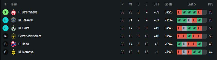 - Maccabi und Beer Sheva liefern sich ein Kopf-an-Kopf-Rennen (für uns wäre besser wenn Beer Sheva Meister wird)