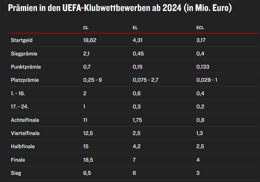 Ausserdem gibt jeder Rang in der Abschlusstabelle nochmals eine gute Viertel-Million. Dazu noch die Sieg und Unentschiedenprämien wenn man nicht absolute Leistungsverweigerung betreibt wie YB.
